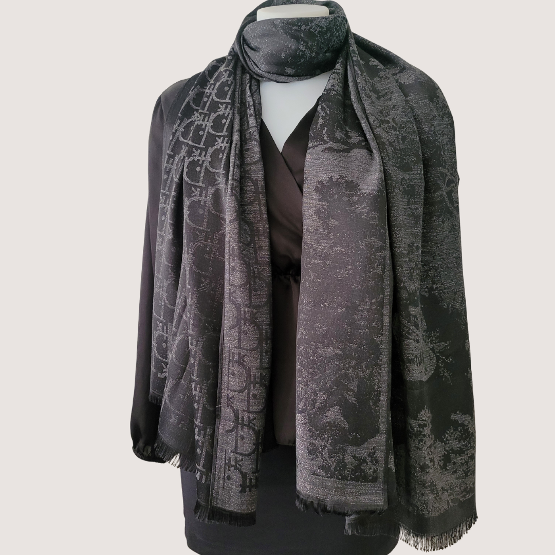 π€ Antraciet sjaal met zilvergrijze accenten β Zijdezacht en licht, gemaakt van 100% polyester. De chique combinatie van antraciet en subtiele zilvergrijze details maakt deze sjaal tijdloos Γ©n veelzijdig voor elke gelegenheid.