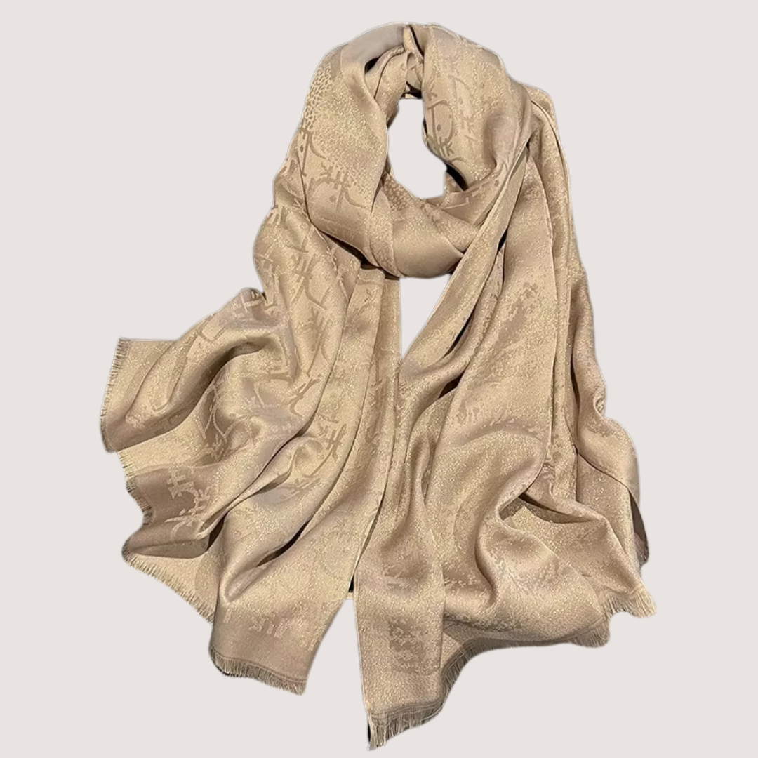 Golden Beige Sjaal – zijdezacht van 100% polyester, met een warme zand-beige tint en een subtiele gouden glans. De stof voelt als zijde op de huid en geeft elke outfit een luxueuze uitstraling.