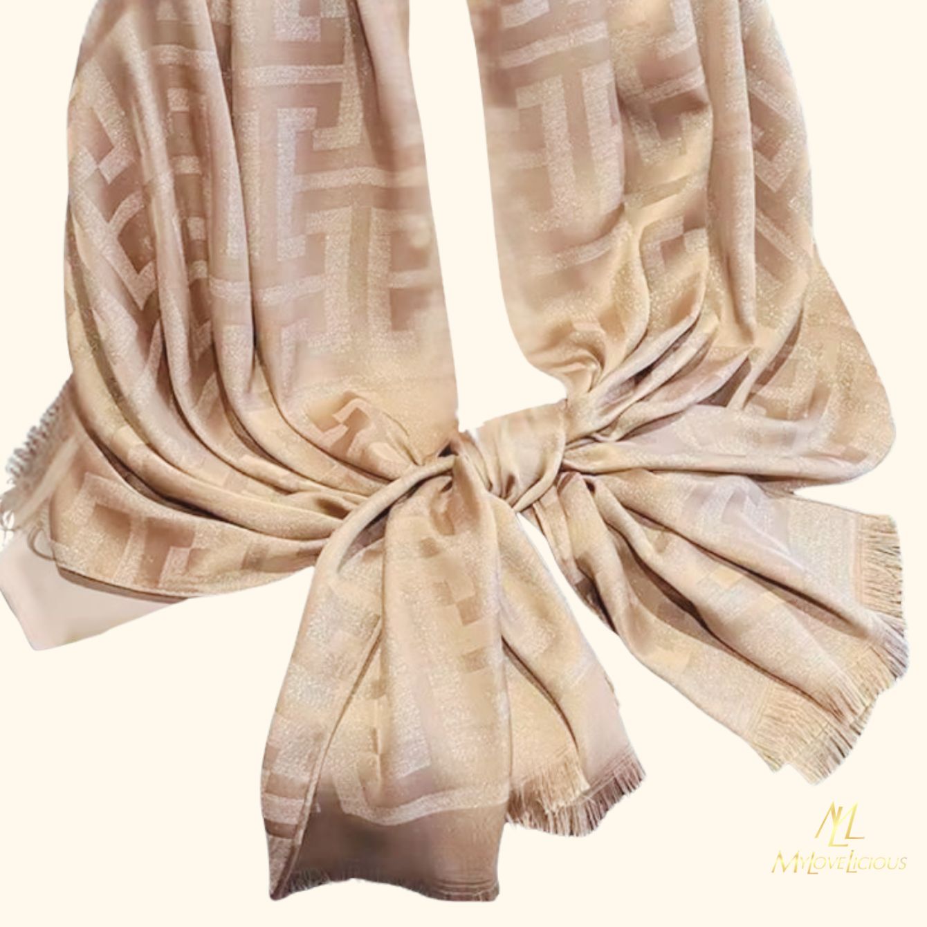🌼 Goud-crème sjaal met stijlvolle print – Zijdezacht aanvoelend en gemaakt van 100% polyester. De luxe uitstraling en elegante kleurstelling maken deze sjaal geschikt voor elke gelegenheid.